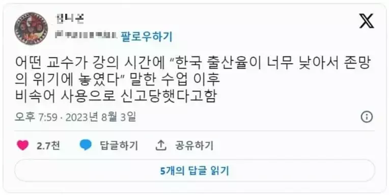 "한국 출산율이 너무 낮아서 존망의 위기에 놓였다" 말한 수업 이후
