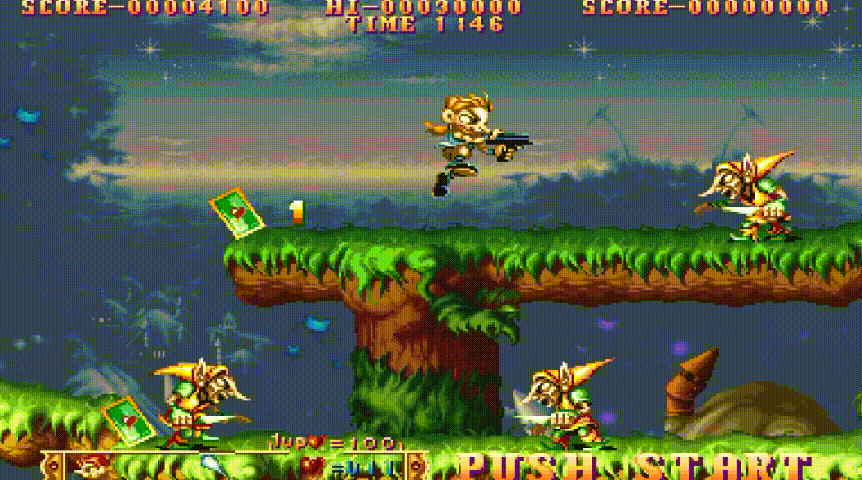 총 3가지 게임이 있는 게임으로 동전을 넣고 횡스크롤 런앤건 게임,